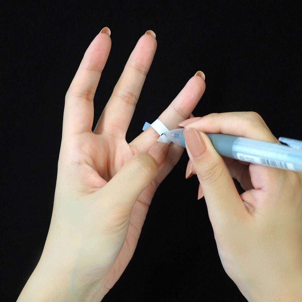 着ける指を選び、その指の第二関節あたりの太い部分に細く切った紙・糸などを一周巻きます。